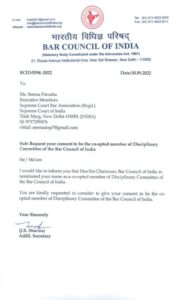 बार काउंसिल ऑफ़ इंडिया के अध्यक्ष मनन कुमार मिश्रा ( वरिष्ठ अधिवक्ता) ने उनका नाम अधिवक्ताओं के पेशेवर आचरण, शिष्टाचार के मानकों और अनुशासनात्मक कार्यवाही करने के लिए नामित किया है।